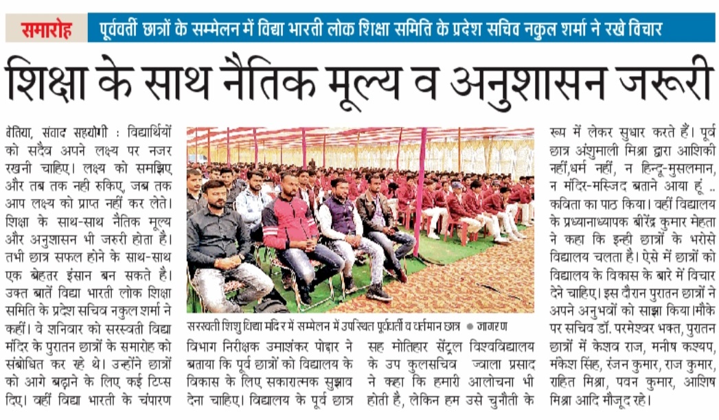 On 8th February 2020 an alumni meet was held at Saraswati Vidya Mandir, Dr. Hedgewar Nagar Barwat Sena, Bettiah located in Uttar Bihar Pranta from 10 am onward. On 9th February, an Annual Function was also held at the school.