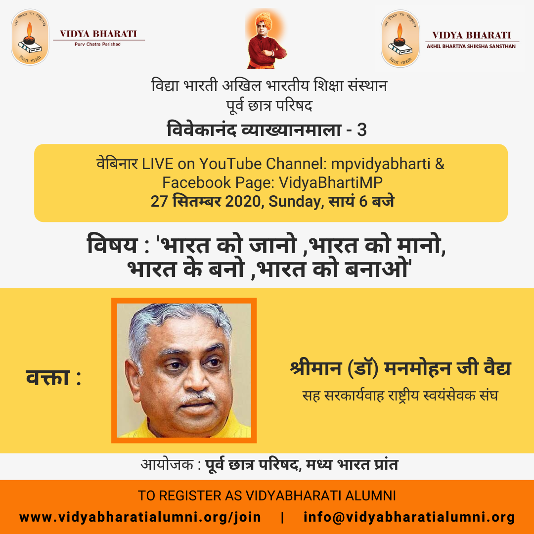 'भारत को जानो ,भारत को मानो, भारत के बनो ,भारत को बनाओ' - 3rd part of Vivekananda Vyakhyanmala webinar series organized by Purv Chhatra Parishad, Vidya Bharati Madhya Bharat. Watch it live on YouTube channel: mpvidyabharti (www.youtube.com/watch?v=-E-1TB9lNmE) and Facebook Page: VidyaBhartiMP (