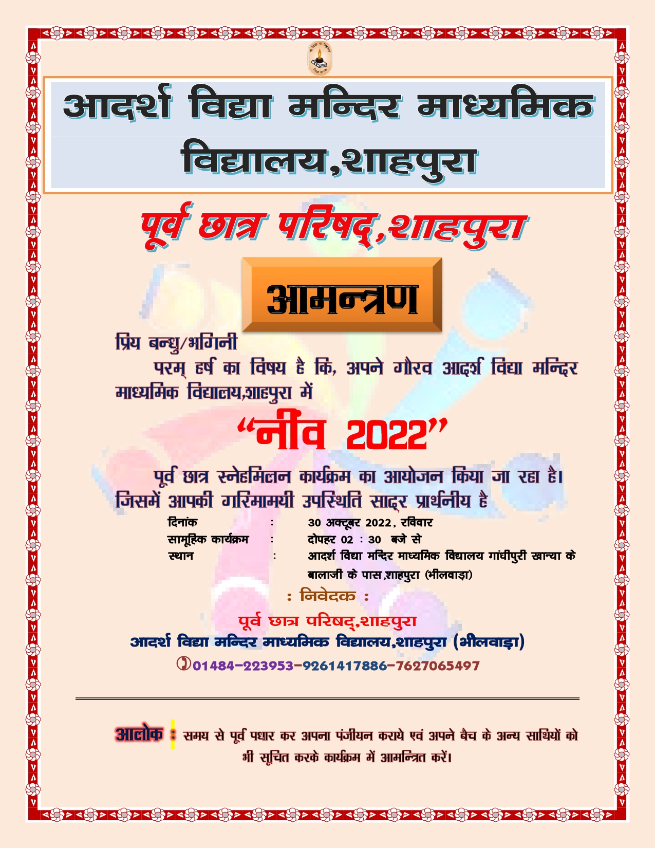 पूर्व छात्र परिषद् शाहपुरा के तत्वावधान में आदर्श विद्या मन्दिर,शाहपुरा का पूर्व छात्र सम्मेलन 30 अक्टूबर रविवार को स्थानीय आदर्श विद्या मन्दिर गांधीपुरी प्रांगण में मनाया जायेगा