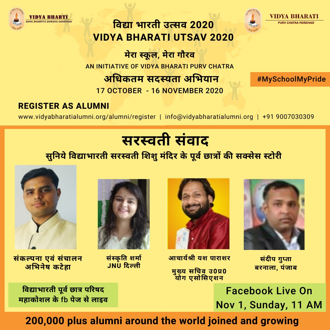 सरस्वती संवाद - सुनिये विद्याभारती सरस्वती शिशु मंदिर के पूर्व छात्रों की सक्सेस स्टोरी. विद्याभारती पूर्व छात्र परिषद महाकोशल के Facebook पेज से लाइव on Nov 1, Sunday, 11 AM. #MySchoolMyPride