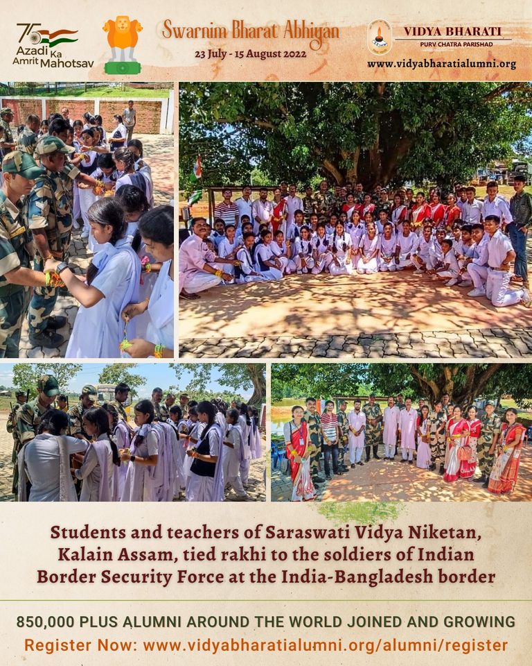 Students and teachers of Saraswati Vidya Niketan, Kalain Assam, tied rakhi to the soldiers of Indian Border Security Force at the India-Bangladesh border.
