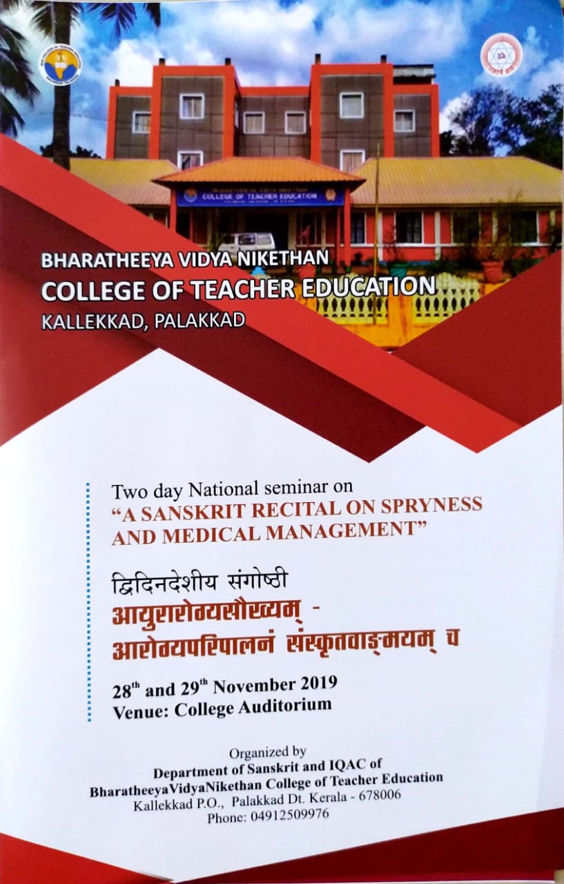Department of Sanskrit and IQAC of Bharatheeya Vidya Nikethan College of Teacher Education, Kallekkad , Palakkad is happy to inform you that two day National Seminar on “A Sanskrit Recital on Spryness and Medical Management” is being organized on 28th and 29th November 2019 in the college auditorium. Experts and eminent personalities from all over the country are expected to participate in the seminar. We cordially invite you to this auspicious occasion.