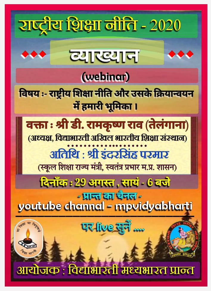 A webinar on 'National education policy and its implementation' has been organised by Vidya Bharati Madhya Bharat Pranta on 29th August on YouTube channel- mpvidyabharti