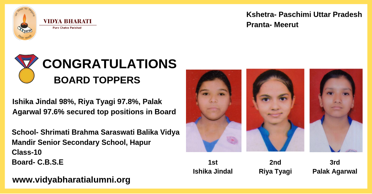 Vidya Bharati is proud of class 10 board examination Board toppers, Ishika Jindal, Riya Tyagi and Palak Agarwal from Paschimi Uttar Pradesh Kshetra.