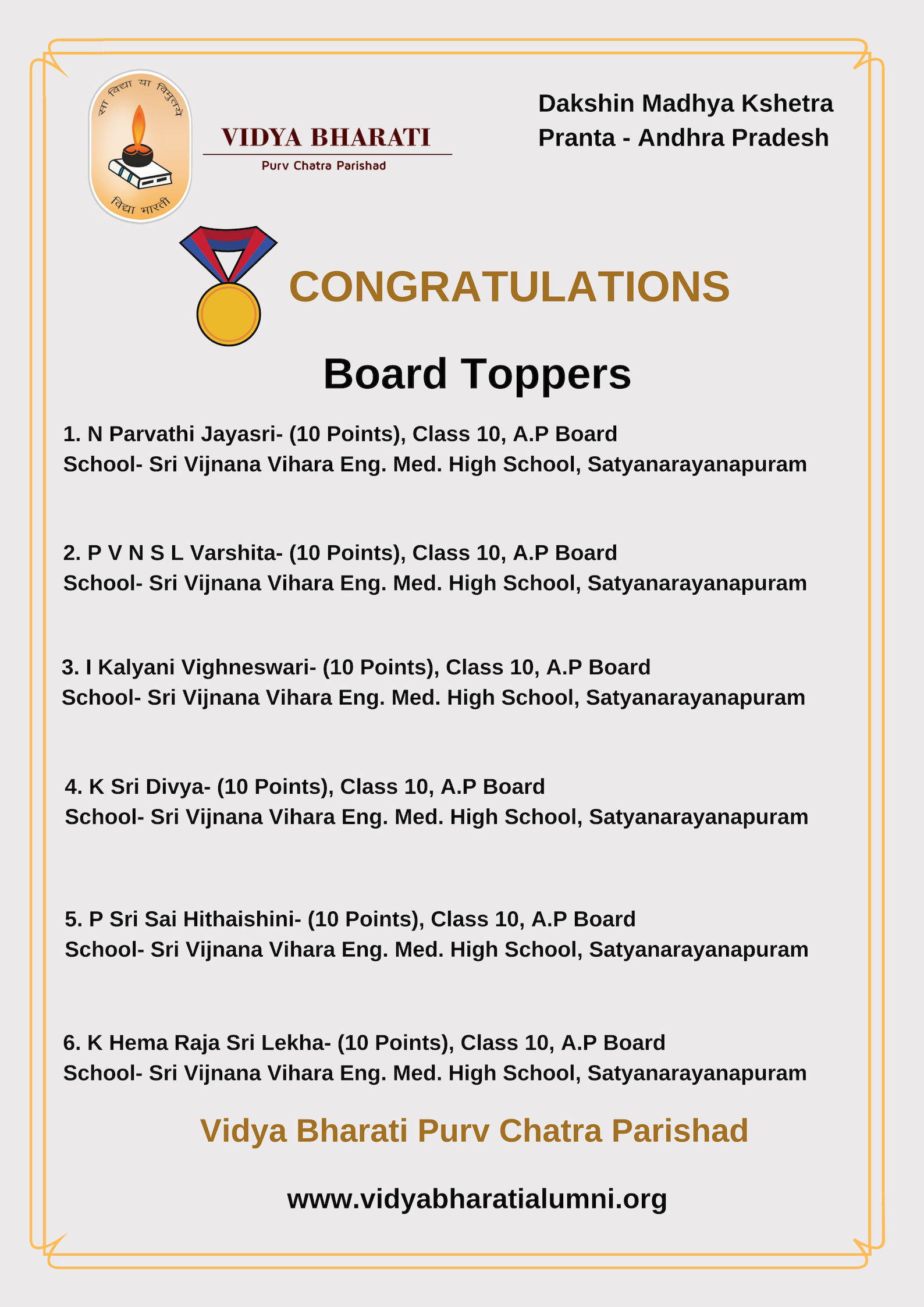 Congratulations to N. Parvathi Jayasri, P.V.N.S.L Varshita, I. Kalyani Vighneawari, K. Sri Divya, P. Sri Sai Hithaishini and K. Hema Raja Sri Lekha from Andhra Pradesh Pranta for securing full marks in the board level.