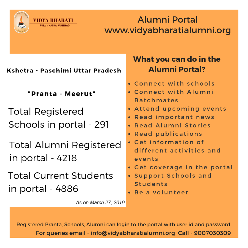 It is an online platform where all the Alumni Students of Vidya Bharati schools will get connected with the schools, students, teachers, donors etc. thus building a vibrant online alumni community.