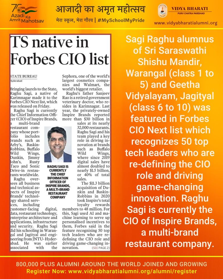Sagi Raghu alumnus of Sri Saraswathi Shishu Mandir, Warangal (class 1 to 5) and Geetha Vidyalayam, Jagityal (class 6 to 10) was featured in Forbes CIO Next list which recognizes 50 top tech leaders who are re-defining the CIO role and driving game-changing innovation. Raghu Sagi is currently the CIO of Inspire Brands, a multi-brand restaurant company.
