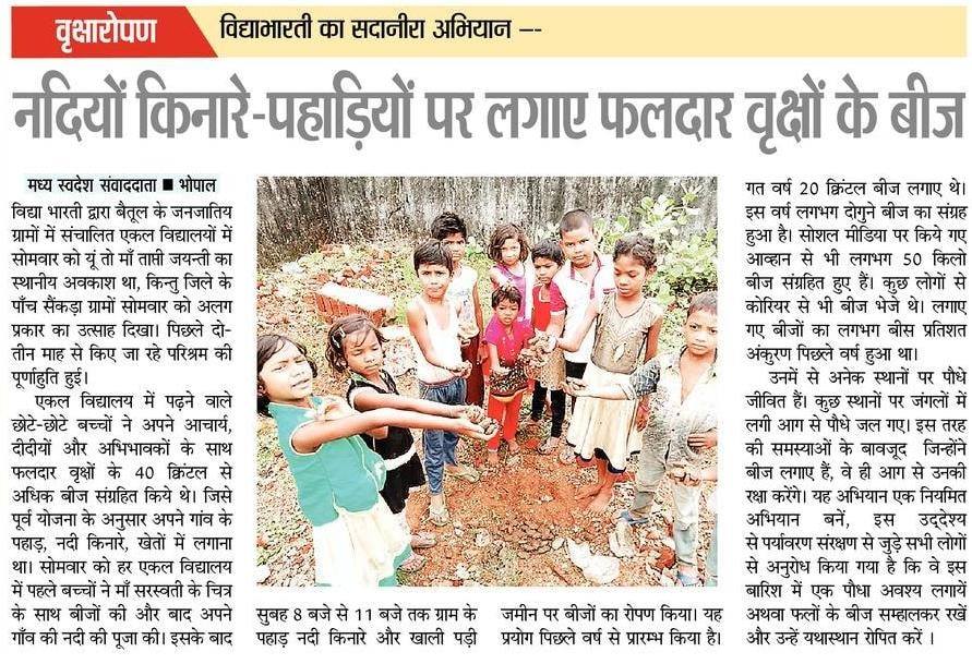 In Betul District of Madhya Pradesh, the students of Vidya Bharati Sanskar Kendras, along with local villagers, planted trees on the hilly banks of Tapti River. This movement had started from last year, with an aim to increase tree cover in the area.