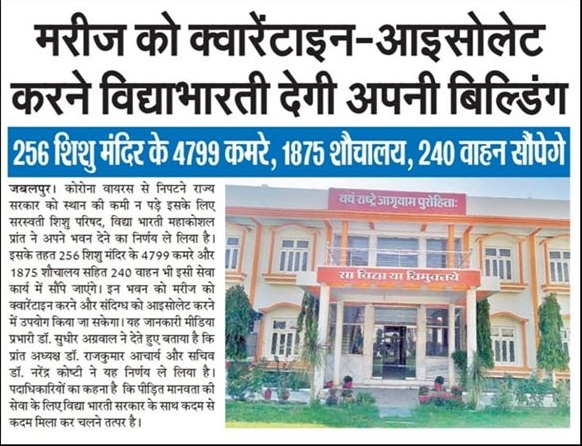 Vidya Bharati Maha Koshal pranta has decided to give its school buildings to the state government to be turned into Covid 19 isolation centres. Under this, 4799 rooms of 256 Shishu Mandirs and 1875 toilets will be available for isolation centres. 240 vehicles will also be assigned to this service.