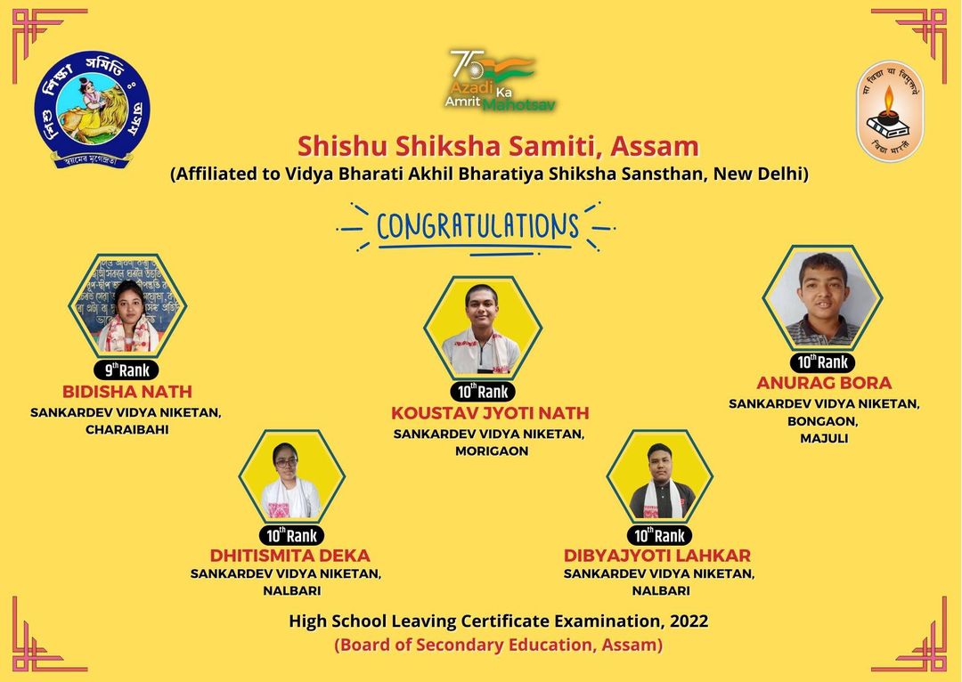 5 students of Shishu Shiksha Samity, Assam, affiliated to Vidya Bharati Akhil Bharatiya Shiksha Sansthan, secured places in top 10 Ranks of Assam High School Examination 2022