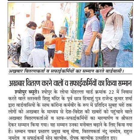 An alumni of Saraswati Shishu Mandir from Sheopur received samman who everyday distributed newspapers informing the society about important news, and the person who cleaned the society got immense respect which contributed and increased their morale values.