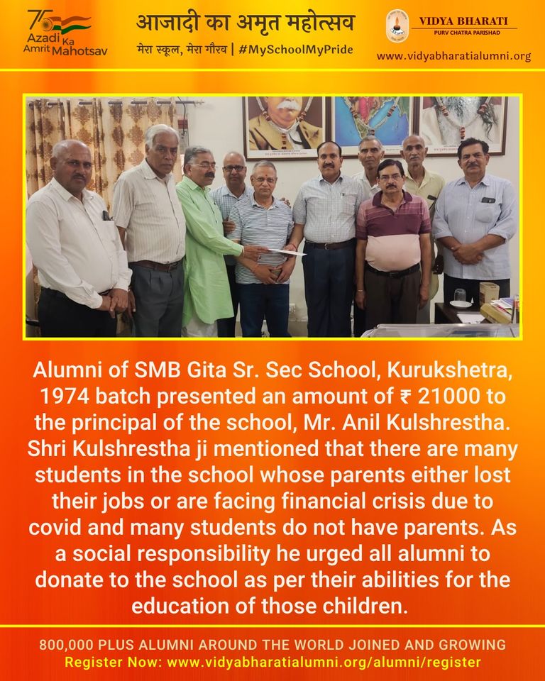 Alumni of SMB Gita Sr. Sec School, Kurukshetra, 1974 batch presented an amount of ₹ 21000 to the principal of the school, Mr. Anil Kulshrestha. Shri Kulshrestha ji mentioned that there are many students in the school whose parents either lost their jobs or are facing financial crisis due to covid and many students do not have parents. As a social responsibility he urged all alumni to donate to the school as per their abilities for the education of those children.