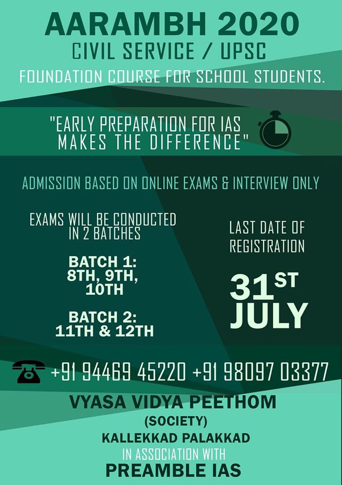 Vidya Bharati School- Vyasa Vidya Peethom, Palakkad, Kerala, in association with Preamble IAS announce d 'AARAMBH 2020'. It is a Civil service foundation course for school students.