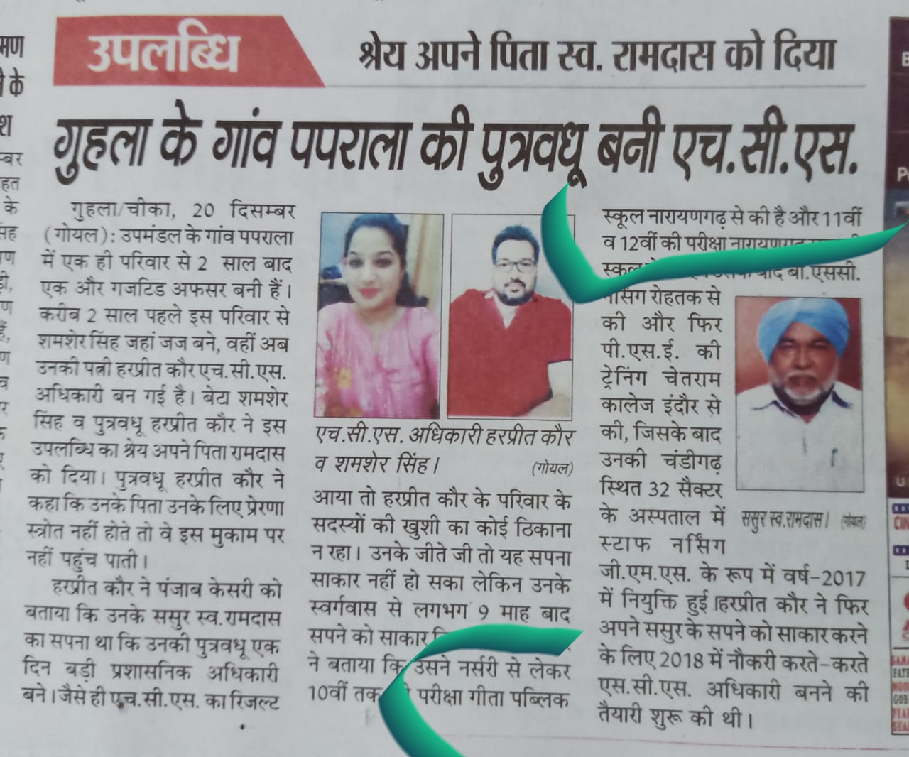 गीता निकेतन आवासीय विद्यालय कुरूक्षेत्र की पूर्व छात्रा महक का चयन एच सी एस के लिए हुआ है। महक विद्यालय के पूर्व अध्यापक दया सिंह स्वामी जी की सुपुत्री है। विद्यालय परिवार को शुभकामनाएं