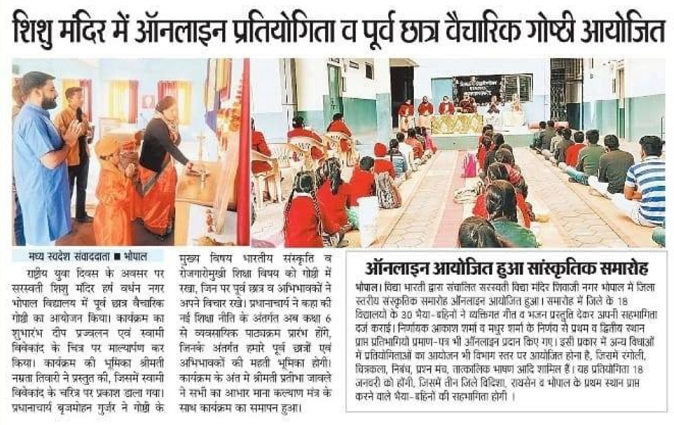राष्ट्रीय युवा दिवस के अवसर पर सरस्वती शिशु मंदिर हर्षवर्धन नगर भोपाल विद्यालय में ऑनलाइन प्रतियोगिता व पूर्व छात्र वैचारिक गोष्ठी आयोजित|