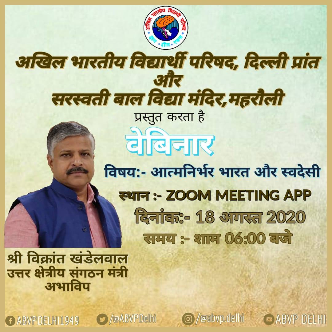 Akhil Bharatiya Vidyarthi Parishad and KLK Saraswati Bal mandir, Mehrauli,conducted Webinar on the "Atmanirbhar Bharat and Swadeshi". Shri Vikrant Khandelwal, Uttar Kshetriya Sangathan Mantri, emphasized on the need of Atmanirbhar Bharat and Swadeshi movement.