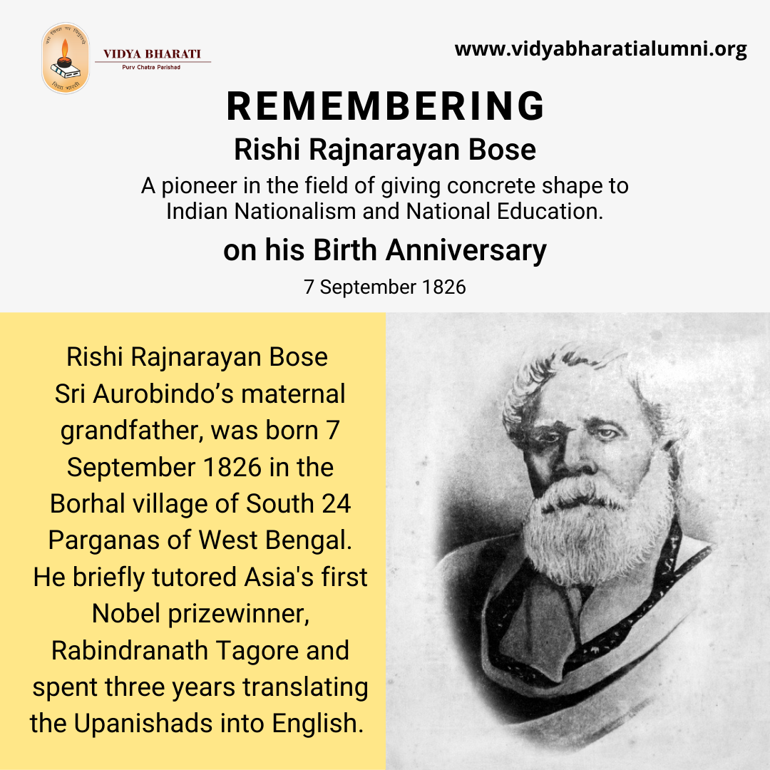 #RishiRajnarayanBose, #SriAurobindo’s maternal grandfather, was born 7 September 1826 in the Borhal village of South 24 Parganas of West Bengal. He had abolished corporal punishment and introduced a friendly and cooperative atmosphere among the teachers and students to make education more interesting to them. He briefly tutored Asia's first Nobel prizewinner, #RabindranathTagore and spent three years translating the #Upanishads into English. As a member of #YoungBengal, Rajnarayan Basu believed in "#NationBuilding" at the grassroots level. He served as the headmaster of Midnapore Zila School which was both the forerunner of Midnapore Collegiate School and Midnapore College. He established a public library that is still in use, now known as the Rishi Rajnarayan Basu Smriti Pathagar.