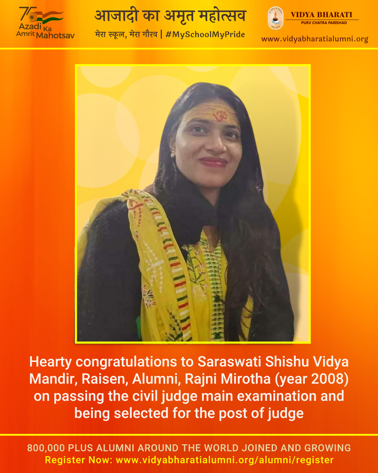 Hearty congratulations to Saraswati Shishu Vidya Mandir, Raisen, Alumni, Rajni Mirotha (year 2008) on passing the civil judge main examination and being selected for the post of judge.