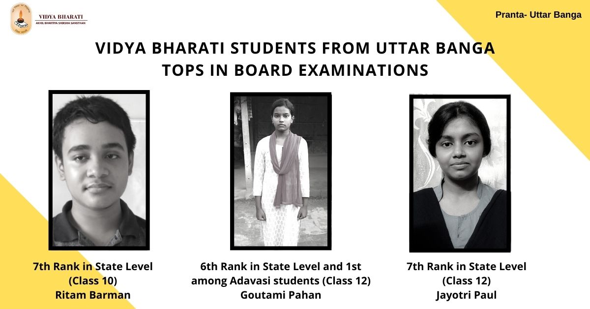 The students from the schools of Uttar Banga Pranta of Vidya Bharati Akhil Bharatiya Shiksha Sansthan showed extraordinary performance in Class 10 and 12 Board Examinations 2020. Out of total 236 students from Vidya Bharati run schools in Uttar Banga 38 students got more than 90% in class 10 board examinations and out of 31 students, 3 students scored more than 90% in class 12 board examinations. Several alumni of these schools ranked at district and state level as well.