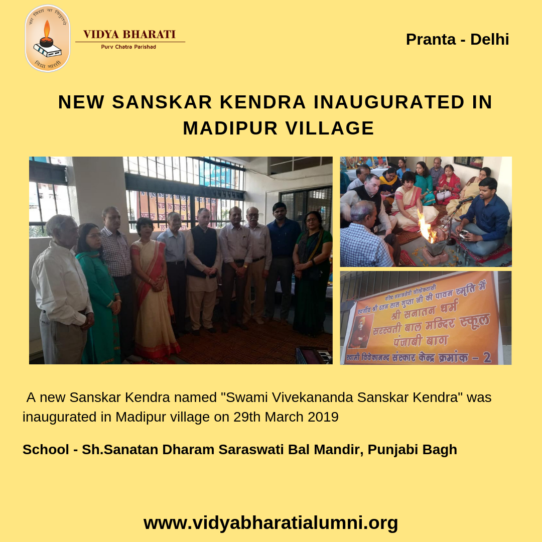 A new Sanskar Kendra was inaugurated in Madipur village in Delhi Pranta under Sh. Sanatan Dharam Saraswati Bal Mandir, Punjabi Bagh. Several dignitaries was present during the ceremony and Mr. Sanjay Gupta was the chief guest.