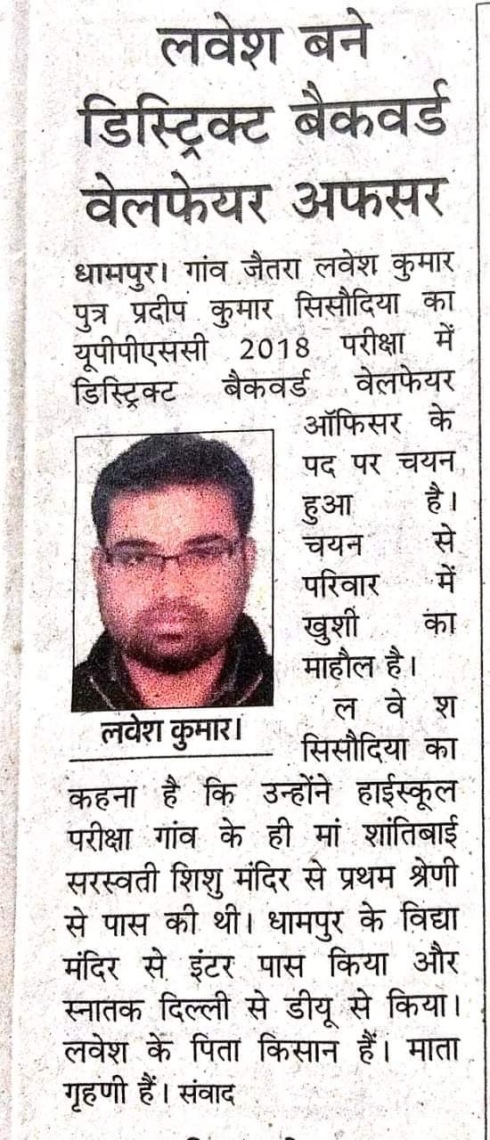 Lavsh Kumar, alumni of Maa Shanti Bai Saraswati Vidya Mandir Inter College, Jaitra Bijnor was appointed as District Backward Welfare Officer. Lavesh hails from Jaitra village of Uttar Pradesh and belongs from a farming family.