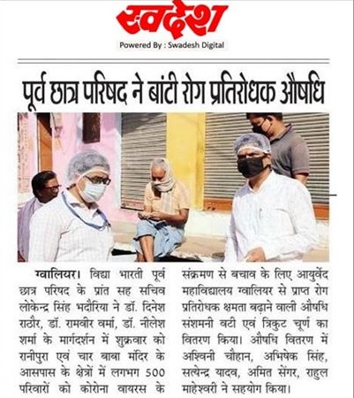 Vidya Bharati Purv Chatra Parishad in Gwalior distributed immunity boosting ayurvedic medicines in an effort to protect the residents against Coronavirus attack under supervision of practicing ayurvedic doctors.
