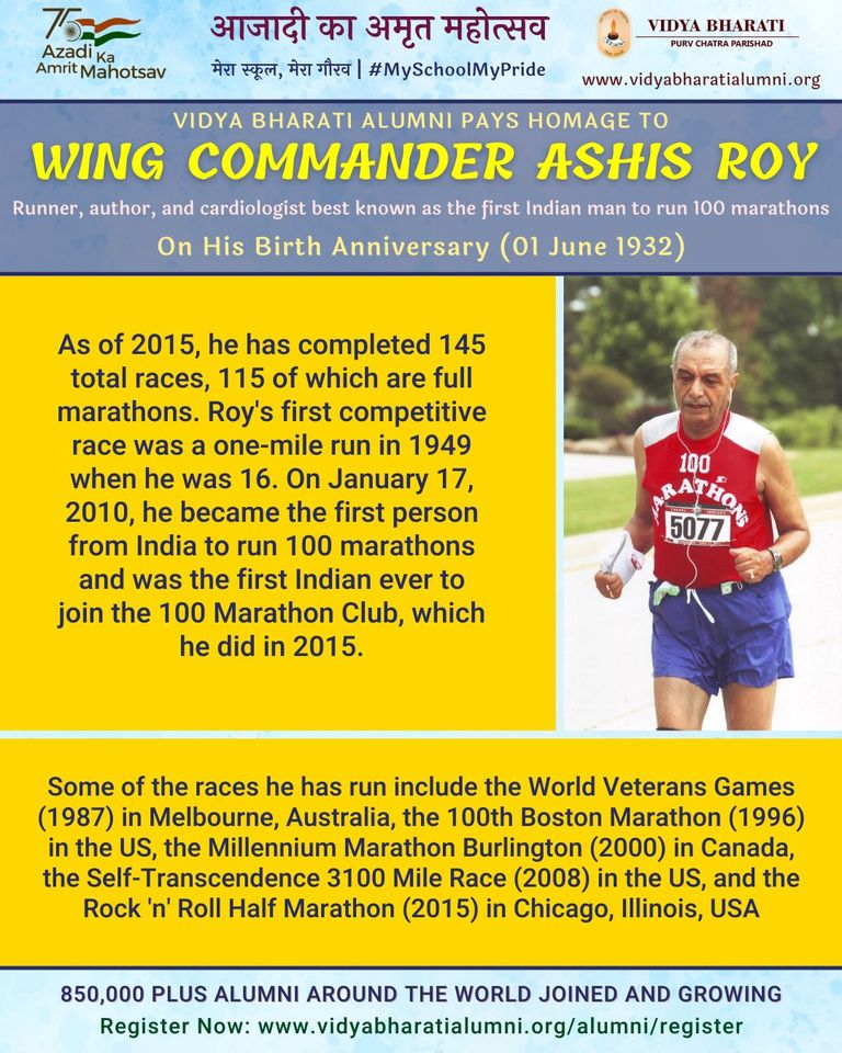 Vidya Bharati Alumni pays homage to Wing Commander Ashis Roy, runner, author, and cardiologist best known as the first Indian man to run 100 marathons, On His Birth Anniversary.
