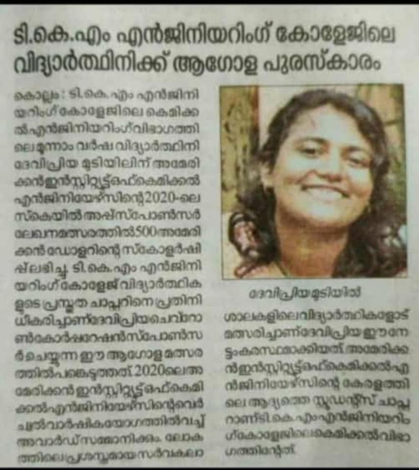 Vidya Bharati alumni Devipriya Mudiyil, of Vidyadhiraja Vidyapeetom Central School, Mavelikara, Kerala, took part in Essay Contest sponsored by Chevron Corporation and won scholarship amount $500 from American Institute of Chemical Engineering.