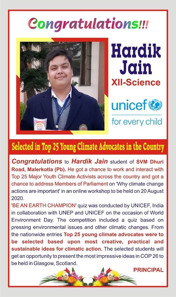 Harik Jain, class 12th student of Sarvhitkari Vidya Mandir, Malerkotla (Pb) school got selected in top 25 'Young Climate Advocates' in the country by 'Unicef' on the occasion of World Environment Day