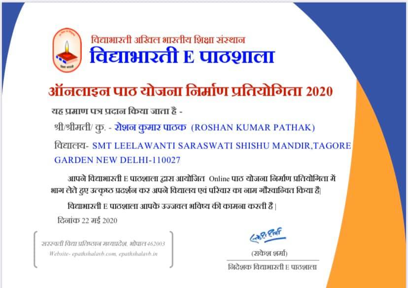 I have received fourth position (4TH POSITION) in the online lesson scheme construction competition 2020 (Acharya class) organized by Vidya Bharti All India Education Institute E-school. A little delay to share this with you allÂ