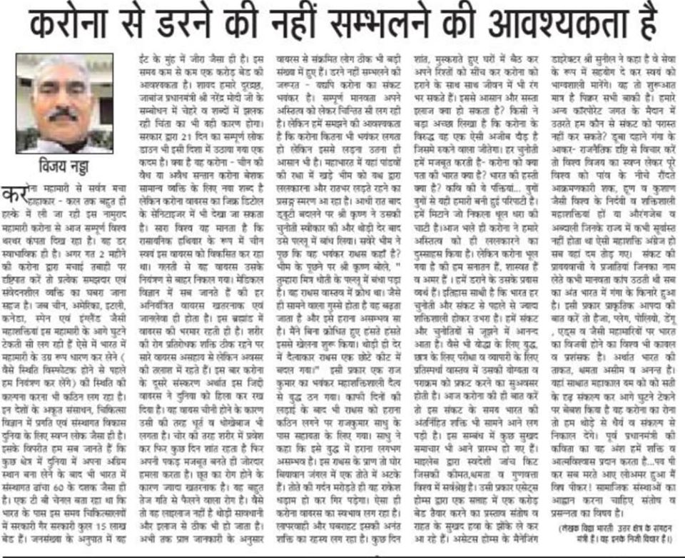 vijay nadda ji's article on the editorial page on corona virus published in samachar newspaper